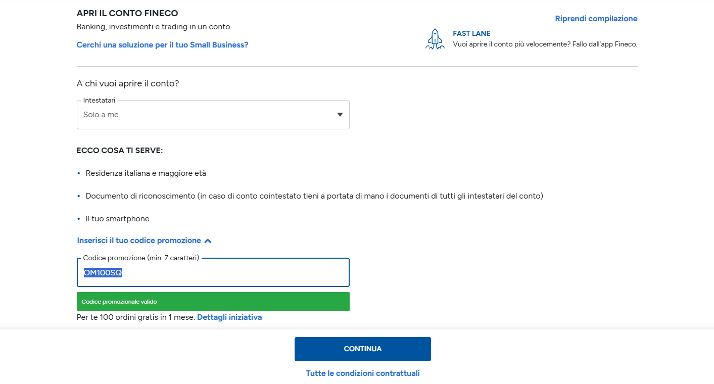 In fase di registrazione puoi inserire il codice promo dedicato per ottenere 100 ordini gratis col trading Fineco. Ti basterà copiarlo e incollarlo nell'apposita sezione quando ti verrà richiesto.