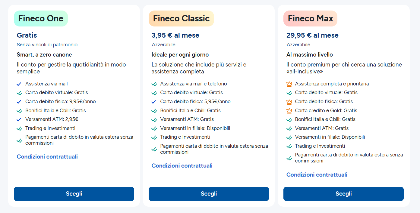 Il conto corrente Fineco, comprensivo anche dei servizi di trading e investimento, è disponibile in tre differenti piani tariffari