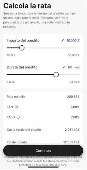 L’importo richiedibile varia da 1.000€ a 50.000€, con una durata che va da 6 a 84 mesi (fino a 7 anni).